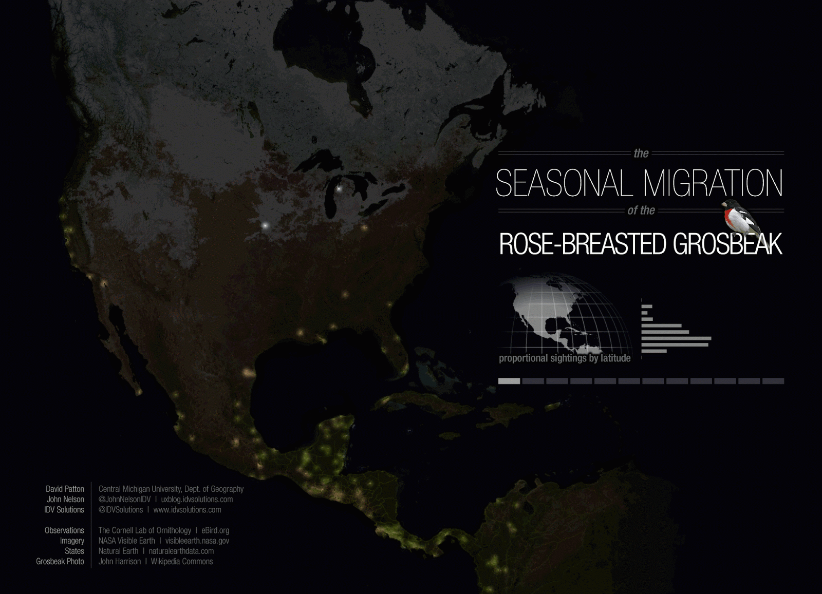 This is the annual migration pattern of the Rose-Breasted Grosbeak. A pretty fantastic voyage for a little thing -which they will undertake up to twelve times in their lives. Each sighting (from the Cornell Lab of Ornithology's eBird project) is a little spotlight that reveals the underlying satellite imagery for that month. When seen together, the wonderful emergent properties of a species' migration illuminates a true bird's eye perspective of movement and structure on a continental-scale.
